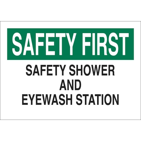 Safety Shower Sign, Sign Subject Matter Eyewash and Shower, Height 10 In., Width 14 In., Sign Material Plastic, Sign Mounting Style With Mounting Holes, Header Safety First, Legend Safety Shower And Eyewash Station, Printed Language English, Sign Shape Rectangle