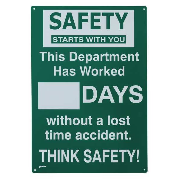 Safety Scoreboard, Sign Legend Safety Starts With You This Department Has Worked ___ Days Without A Lost Time Accident. Think Safety!, English, Height 20 in, Width 14 in, Vertical Rectangle, Background Color Green, Number of Displays 1, Display Format Number of Days
