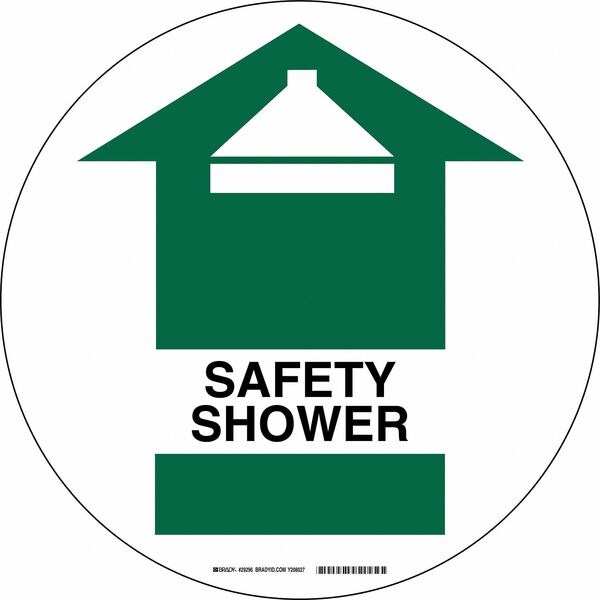 Safety Shower Sign, Sign Subject Matter Eyewash and Shower, Height 17 In., Width 17 In., Sign Material Vinyl, Sign Mounting Style Adhesive Surface, Header No Header, Legend Safety Shower, Printed Language English, Sign Shape Circle