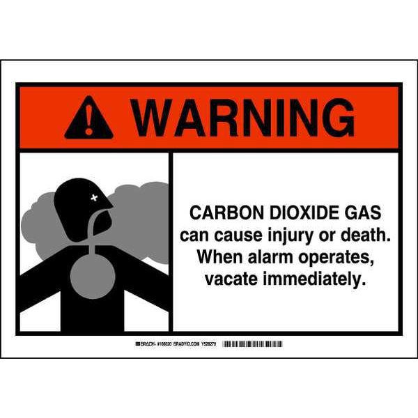 Safety Sign, Sign Subject Matter Chemical, Gas or Hazardous Materials, Height 10 in, Width 14 in, Sign Material Aluminum, Sign Mounting Style With Mounting Holes, Header Warning, Legend Carbon Dioxide Gas Can Cause Injury Or Death. When Alarm Operates, Vacate Immediately., Printed Language English, Sign Shape Rectangle
