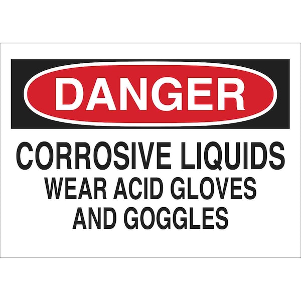 Safety Sign, Sign Subject Matter Personal Protection, Height 10 in, Width 14 in, Sign Material Aluminum, Sign Mounting Style With Mounting Holes, Header Danger, Legend Corrosive Liquids Wear Acid Gloves And Goggles, Printed Language English, Sign Shape Rectangle