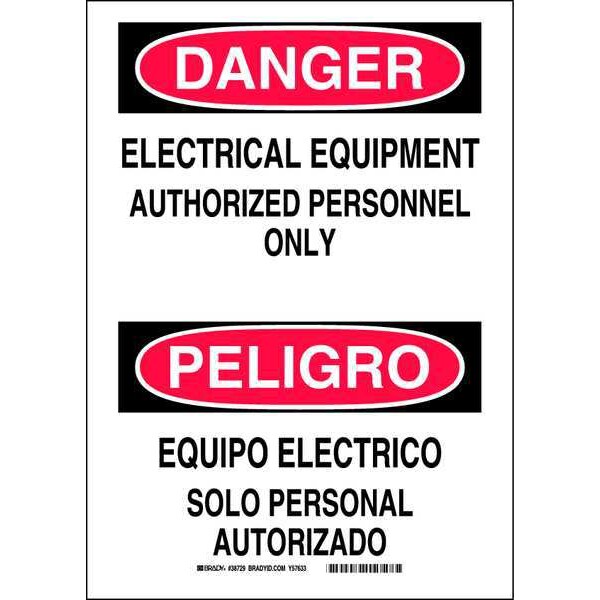 Safety Sign, Sign Subject Matter Electrical Hazard, Height 10 in, Width 14 in, Sign Material Plastic, Sign Mounting Style With Mounting Holes, Header Danger/Peligro, Legend Electrical Equipment Authorized Personnel Only/Equipo Electrico, Printed Language English, Spanish, Sign Shape Rectangle