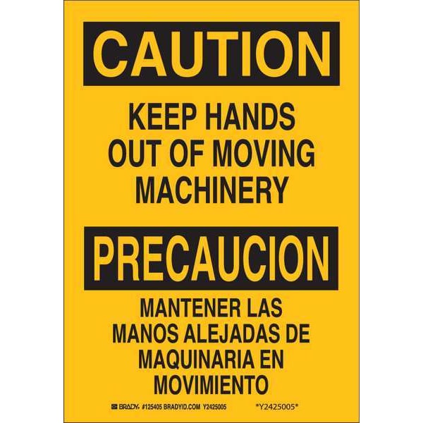 Safety Sign, Sign Subject Matter Keep Hands Clear, Height 10 in, Width 7 in, Sign Material Polyester, Header Caution/Precaucion, Legend Keep Hands Out Of Moving Machinery/Mantener Las Ma, Printed Language English, Spanish, Sign Shape Rectangle