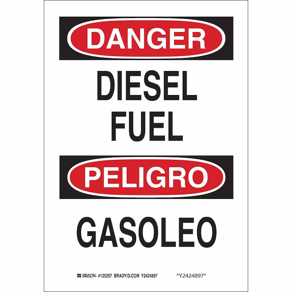 Safety Sign, Sign Subject Matter Chemical, Gas or Hazardous Materials, Height 14 in, Width 10 in, Sign Material Aluminum, Sign Mounting Style With Mounting Holes, Header Danger/Peligro, Legend Diesel Fuel/Gasoleo, Printed Language English, Spanish, Sign Shape Rectangle