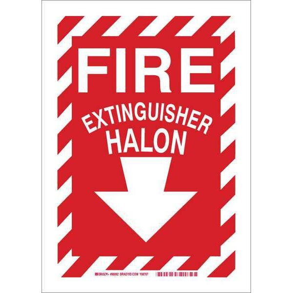 Safety Sign, Sign Subject Matter Fire Equipment, Height 14 in, Width 10 in, Sign Material Polyester, Sign Mounting Style Adhesive Surface, Header No Header, Legend Fire Extinguisher Halon, Printed Language English, Sign Shape Rectangle