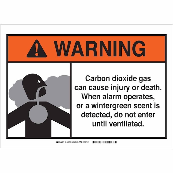 Safety Sign, Sign Subject Matter Chemical, Gas or Hazardous Materials, Height 7 in, Width 10 in, Sign Material Plastic, Sign Mounting Style With Mounting Holes, Header Warning, Legend Carbon Dioxide Gas Can Cause Injury Or Death. When Alarm Operates, Or A Wintergreen Scent Is Detected, Do Not Enter Until Ventilated., Printed Language English, Sign Shape Rectangle