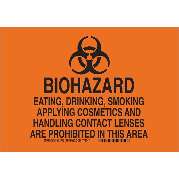 Safety Sign, Sign Subject Matter Eating and Drinking Restriction, Height 7 in, Width 10 in, Sign Material Polyester, Sign Mounting Style Adhesive Surface, Header No Header, Legend Biohazard Eating, Drinking, Smoking, Applying Cosmetics And Handling Contact Lenses Are Prohibited In This Area, Printed Language English, Sign Shape Rectangle