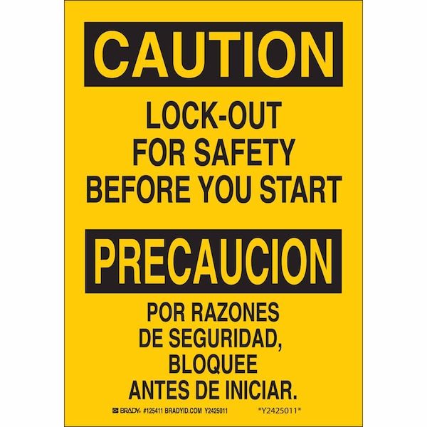 Safety Sign, Sign Subject Matter Lockout Tagout, Height 10 in, Width 7 in, Sign Material Plastic, Header Caution/Precaucion, Legend Lock-Out For Safety Before You Start/Por Razones De Seguridad, Bloquee Antes De Iniciar, Printed Language English, Spanish, Sign Shape Rectangle