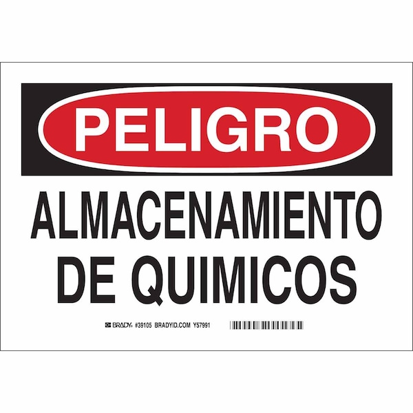 Safety Sign, Sign Subject Matter Chemical, Gas or Hazardous Materials, Height 7 in, Width 10 in, Sign Material Plastic, Sign Mounting Style With Mounting Holes, Header Peligro, Legend Almacenamiento De Quimicos, Printed Language Spanish, Sign Shape Rectangle