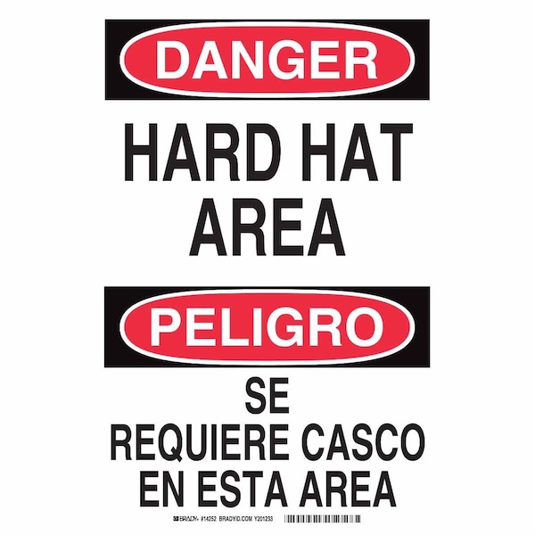 Safety Sign, Sign Subject Matter Personal Protection, Height 14 in, Width 10 in, Sign Material Polyester, Sign Mounting Style Adhesive Surface, Header Danger/Peligro, Legend Hard Hat Area/Se Requiere Casco En Esta Area, Printed Language English, Spanish, Sign Shape Rectangle