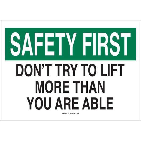 Safety Slogan Sign, Sign Subject Matter Safety Incentive and Motivational, Height 10 In., Width 14 In., Sign Material Polyester, Sign Mounting Style Adhesive Surface, Header Safety First, Legend Don't Try To Lift More Than You Are Able, Printed Language English, Sign Shape Rectangle