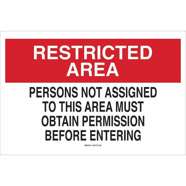 Security Sign, Sign Subject Matter Authorized Personnel and Restricted Access, Height 10 in, Width 14 in, Sign Material Aluminum, Sign Mounting Style With Mounting Holes, Header Restricted Area, Legend Persons Not Assigned To This Area Must Obtain Permission Before Entering, Printed Language English, Sign Shape Rectangle