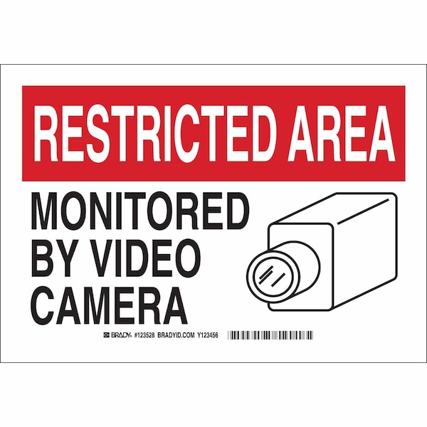 Security Sign, Sign Subject Matter Security and Surveillance, Height 10 in, Width 14 in, Sign Material Polyester, Sign Mounting Style Adhesive Surface, Header Restricted Area, Legend Monitored By Video Camera, Printed Language English, Sign Shape Rectangle