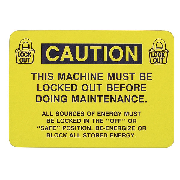 Sign, Horizontal Rectangle, Number of Printed Sides 1, English, Sign Format Traditional OSHA, Sign Legend This Machine Must Be Locked Out Before Doing Maintenance. All Sources Of Energy Must Be Locked In The Inoff In Or Insafe In Position. De-Energize Or Block All Stored Energy, Sign Legend Style Symbol and Text