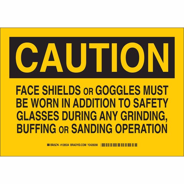 Caution Sign, Sign Subject Matter Personal Protection, Height 7 in, Width 10 in, Sign Material Polyester, Header Caution, Legend Face Shields Or Goggles Must Be Worn In Addition To Safety Glasses During Any Grinding, Buffing Or Sanding Operation, Printed Language English, Sign Shape Rectangle