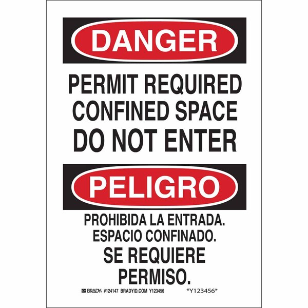 Danger Sign, Sign Subject Matter Confined Space, Height 14 in, Width 10 in, Sign Material Polyester, Sign Mounting Style Adhesive Surface, Header Danger/Peligro, Legend Permit Required Confined Space Do Not Enter/Prohibida La Entrada. Espacio Confinado. Se Requiere Permiso., Printed Language English, Spanish, Sign Shape Rectangle