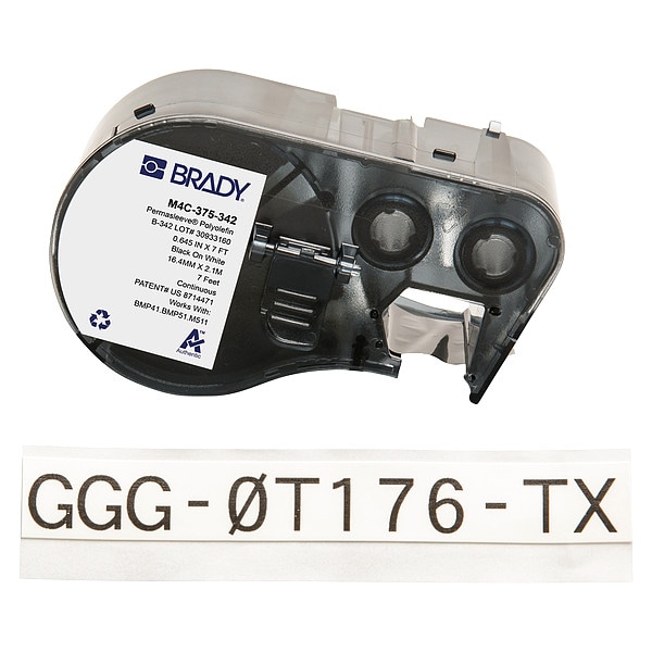 Sleeve Label, Adhesive Properties Non-Adhesive, Material Properties Flame-Retardant, Label Material Polyolefin, Label Color White, Label Finish Matte, Label Height 21/32 in, Label Width 1 in, Compatible Mfr Part Number BMP41, BMP51, BMP53, M511, Compatible Grainger Part Number 20XX01, 20XX02, 20XX04, 21U174, 21U176, 21U177, 21U178, 21U179, 21U180, 29YJ26, 810HX3, 810HX4, Recommended Ribbon R6000, R6600, Printer Series Compatibility BMP41, BMP51, BMP53, M410, M510, M511