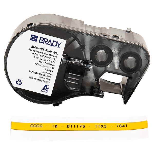 Sleeve Label, Adhesive Properties Non-Adhesive, Material Properties Halogen-Free, Low-Smoke, Label Material Polyolefin, Label Color Yellow, Label Finish Matte, Label Height 1/4 in, Label Width 1 in, Compatible Mfr Part Number BMP41, BMP51, BMP53, M511, Compatible Grainger Part Number 20XX01, 20XX02, 20XX04, 21U174, 21U176, 21U177, 21U178, 21U179, 21U180, 29YJ26, 810HX3, 810HX4, Recommended Ribbon R6000, R6600, Printer Series Compatibility BMP41, BMP51, BMP53, M410, M510, M511