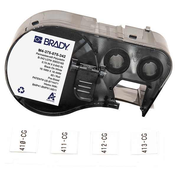 Sleeve Label, Adhesive Properties Non-Adhesive, Material Properties Flame Retardant, Heat Shrinkable, Label Material Polyolefin, Label Color White, Label Finish Matte, Label Height 21/32 in, Label Width 3/4 in, Number of Labels Included 80, Compatible Mfr Part Number BMP-41, BMP-51, BMP-53, M511, Compatible Grainger Part Number 20XX01, 20XX02, 20XX04, 21U174, 21U176, 21U177, 21U178, 21U179, 21U180, 29YJ26, 810HX3, 810HX4, Recommended Ribbon R4300