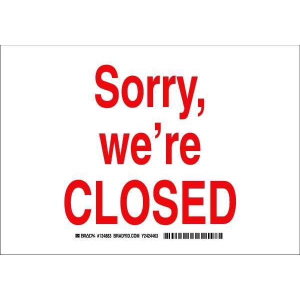 Facility Sign, Sign Subject Matter Facility, Height 7 In., Width 10 In., Sign Material Polyester, Sign Mounting Style Adhesive Surface, Header No Header, Legend Sorry, We're Closed, Printed Language English, Sign Shape Rectangle