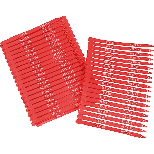 Primary Application Truck, Trailer, Container, Lock Seal, Material Plastic, Red, Length 7-1/2 In., Number of Digits 6, Imprinting 1 Line of 6 Characters, Wire Length 7-1/2 In., Imprint Area Width 3/16 In., Legend Seal, Package Quantity 100