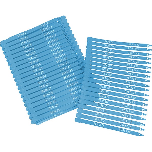 Strap Seals, Plastic, Blue, Marking Parameters Consecutive Numbering, SEALED, Strap Length 7 1/2 in, Strap Width 1/4 in, Breaking Strength 45 lb, Package Quantity 100