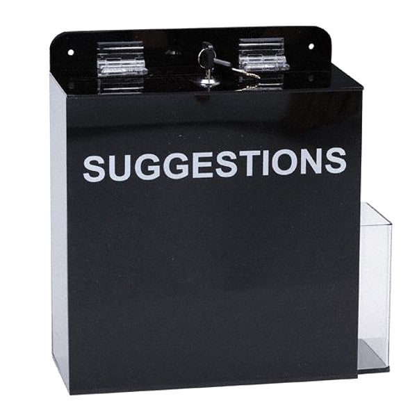 Suggestion Box, Material Acrylic, Black/White, Height 12 in, Width 11 3/4 in, Depth 4 3/4 in, Mounts To Wall, Sits On Table, Includes Lockable Top, Side Pocket