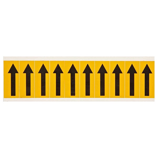 Symbol Label, Adhesive Type Permanent Adhesive, Application General Identification, Pipe and Valve Marking, APWA Compliant Color No, Background Color Yellow, Character Color Black, Character Color Gradient Solid Color, Character Height 1 15/16 in, Character Outline Color Not Applicable, Character Type Symbols, Characters Included Arrow, Die Cut Yes, Embossed No, Font Gothic, Includes (10) Cards, Indoor/Outdoor Usage Indoor/Outdoor, Letter Casing Uppercase, Material Vinyl
