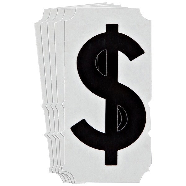 Symbol Label, Adhesive Type Permanent Adhesive, Application General Identification, APWA Compliant Color No, Background Color Not Applicable, Character Color Black, Character Color Gradient Solid Color, Character Height 6 in, Character Outline Color Not Applicable, Character Type Symbols, Characters Included Dollar Sign ($), Die Cut Yes, Embossed No, Font Gothic, Includes (10) Labels, Indoor/Outdoor Usage Indoor/Outdoor, Letter Casing Uppercase, Material Polyester