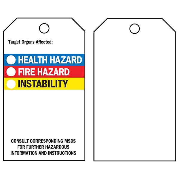 Tag, Color Black, Blue, Red, Yellow, Fastener Attachment Length 7 in, Fastener Type Nylon Tie, Hazard Communication Standard HMIS, Height 5 3/4 in, Includes (25) Nylon Ties, Indoor/Outdoor Usage Indoor/Outdoor, Lamination Type Not Laminated, Language English, Legend Same on Both Sides No, Mounting Hole Reinforcement Type Metal, Mounting Hole Size 3/8 in, Number of Printed Sides 1, Number of Tags 25, Preprinted Images (Reverse Side) Not Applicable, Preprinted Images HMIS Box