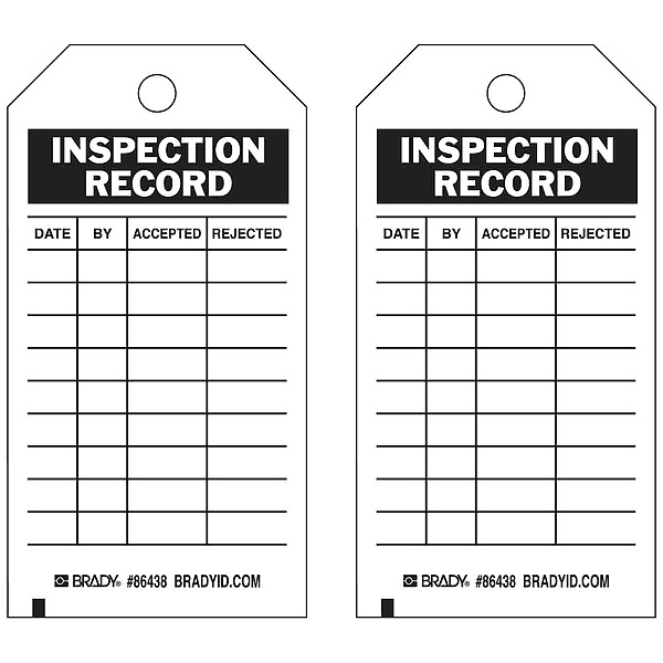 Tag, Compatible Tag Holder Mfr Part Number Not Applicable, Compatible Tag Insert Mfr Part Number Not Applicable, Fastener Attachment Length 7 in, Fastener Type Nylon Tie, Header Wording (Reverse Side) Inspection Record, Header Wording Inspection Record, Height 5 3/4 in, Indoor/Outdoor Usage Indoor/Outdoor, Lamination Type Laminated, Language English, Mounting Hole Reinforcement Type Metal, Mounting Hole Size 3/8 in, Number of Tags 10, Preprinted Legend Date___By___Accepted___Rejected___