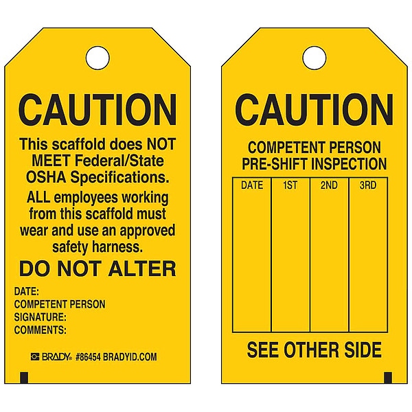 Tag, Inspection, Heavy Duty Polyester, 5 3/4 in H x 3 in W, Black on Yellow, Rectangle, 10 PK