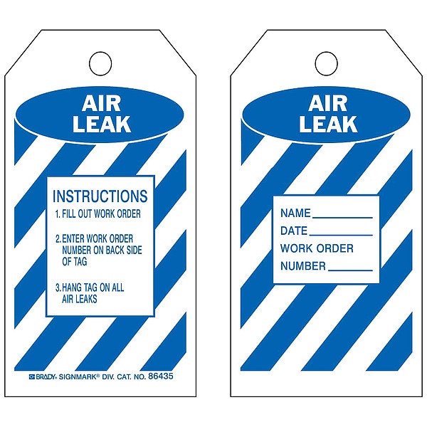 Tag, Compatible Tag Holder Mfr Part Number Not Applicable, Compatible Tag Insert Mfr Part Number Not Applicable, Fastener Attachment Length 7 in, Fastener Type Nylon Tie, Header Wording (Reverse Side) Air Leak, Header Wording Air Leak, Height 5 3/4 in, Indoor/Outdoor Usage Indoor/Outdoor, Lamination Type Laminated, Language English, Mounting Hole Reinforcement Type Metal, Mounting Hole Size 3/8 in, Number of Tags 10