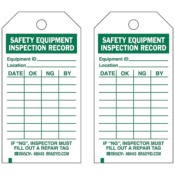 Tag, Compatible Tag Holder Mfr Part Number Not Applicable, Compatible Tag Insert Mfr Part Number Not Applicable, Fastener Attachment Length 7 in, Fastener Type Nylon Tie, Header Wording (Reverse Side) Safety Equipment Inspection Record, Header Wording Safety Equipment Inspection Record, Height 5 3/4 in, Indoor/Outdoor Usage Indoor/Outdoor, Lamination Type Laminated, Language English, Mounting Hole Reinforcement Type Metal, Mounting Hole Size 3/8 in, Number of Tags 10