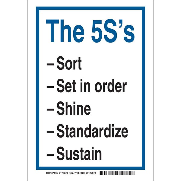 Safety Reminder Sign, Sign Subject Matter Facility, Height 14 In., Width 10 In., Sign Material Polyester, Sign Mounting Style Adhesive Surface, Header The 5S'S, Legend The 5S's Sort -Set In Order -Shine -Standardize -Sustain, Printed Language English, Sign Shape Rectangle