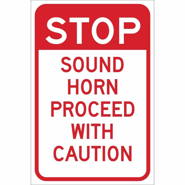 Traffic Sign, Sign Subject Matter Lift Truck Traffic, Height 18 In., Width 12 In., Sign Material Aluminum, Sign Mounting Style With Mounting Holes, Header Stop, Legend Sound Horn Proceed With Caution, Printed Language English, Sign Shape Rectangle
