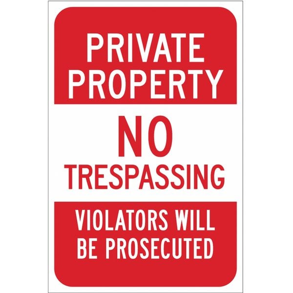 Traffic Sign, Sign Subject Matter Trespassing and Property, Height 18 in, Width 12 in, Sign Material Aluminum, Header Private Property, Legend No Trespassing Violators Will Be Prosecuted, Printed Language English, Sign Shape Rectangle
