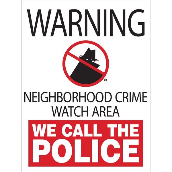 Traffic Sign, Sign Subject Matter Security and Surveillance, Height 18 in, Width 24 in, Sign Material Aluminum, Sign Mounting Style With Mounting Holes, Header Warning, Legend Neighborhood Crime Watch Area We Call The Police, Printed Language English, Sign Shape Rectangle