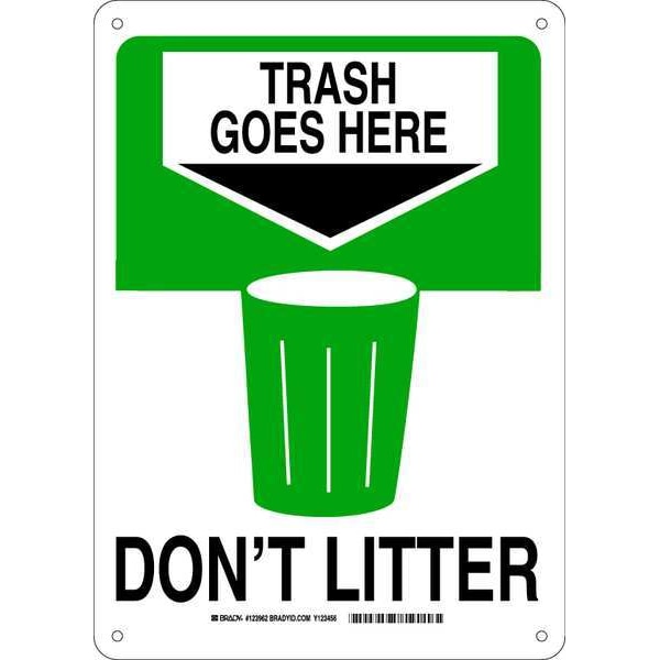 Trash Goes Here, Don't Litter, 10 in W x 14 in H, Rectangle, Aluminum, 123962