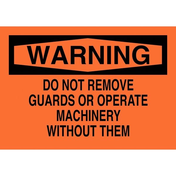 Warning Sign, Sign Subject Matter Machine Guarding, Height 7 In., Width 10 In., Sign Material Plastic, Sign Mounting Style With Mounting Holes, Header Warning, Legend Do Not Remove Guards Or Operate Machinery Without, Printed Language English, Sign Shape Rectangle
