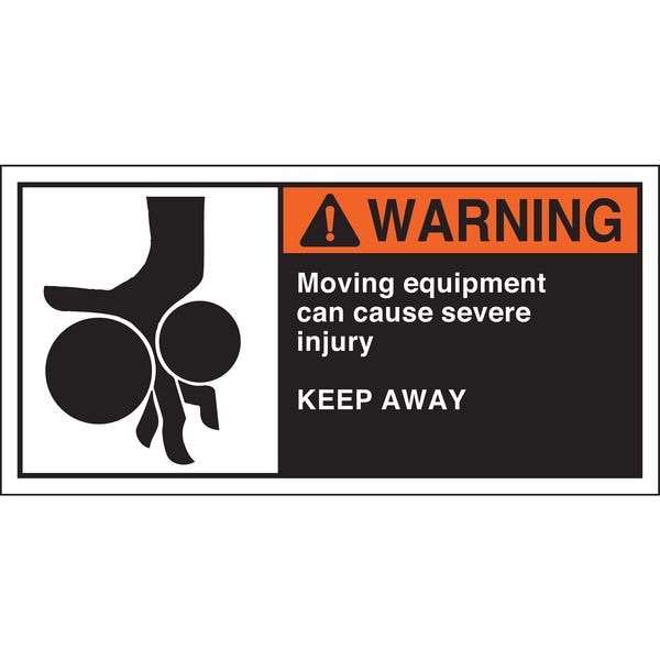 Label, Horizontal Rectangle, Number of Printed Sides 1, English, Sign Legend MOVING EQUIPMENT CAN CAUSE SEVERE INJURY KEEP AWAY, Sign Legend Style Symbol and Text, Package Quantity 5