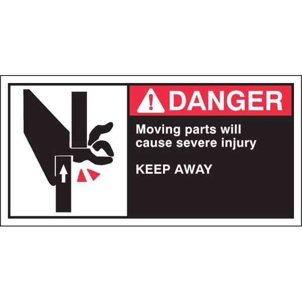 Label, Horizontal Rectangle, Number of Printed Sides 1, English, Sign Legend MOVING PARTS WILL CAUSE SEVERE INJURY KEEP AWAY, Sign Legend Style Symbol and Text, Package Quantity 5