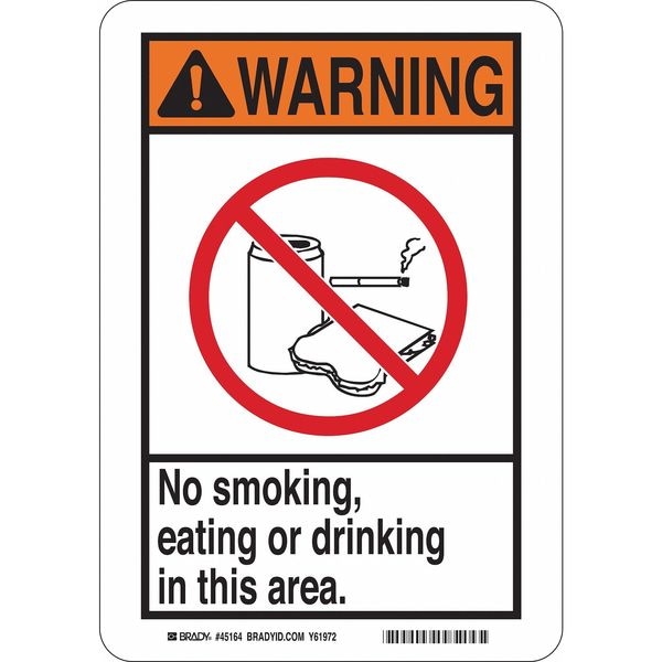 Warning No Smoking Sign, Sign Subject Matter No Smoking, Height 14 in, Width 10 in, Sign Material Polyester, Sign Mounting Style Adhesive Surface, Header Warning, Legend No Smoking, Eating Or Drinking In This Area., Printed Language English, Sign Shape Rectangle