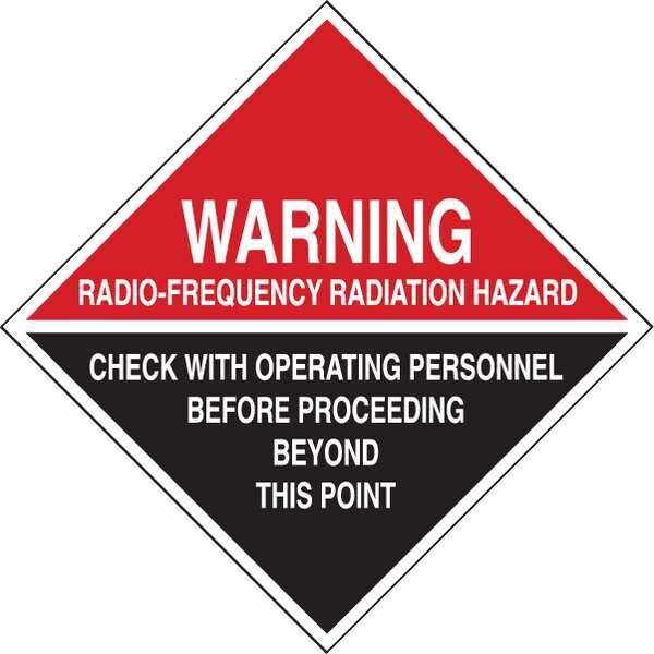 Warning Sign, Sign Subject Matter Radiation and X-Ray, Height 18 in, Width 18 in, Sign Material Polyester, Sign Mounting Style Adhesive Surface, Header Warning, Legend Radio-Frequency Radiation Hazard Check With Operating Personnel Before Proceeding Beyond This Point, Printed Language English, Sign Shape Diamond