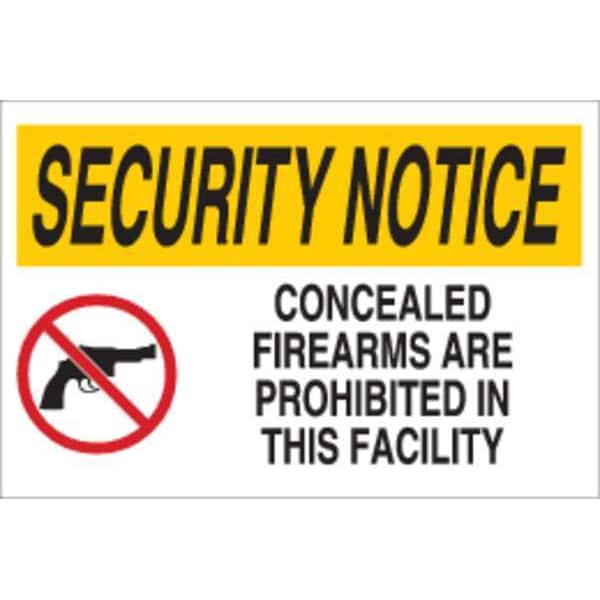 Warning Sign, Sign Subject Matter Weapons, Devices or Substances, Height 18 in, Width 12 in, Sign Material Aluminum, Sign Mounting Style Surface, Header Security Notice, Legend Concealed Firearms Are Prohibited in This Facility, Printed Language English, Sign Shape Rectangle