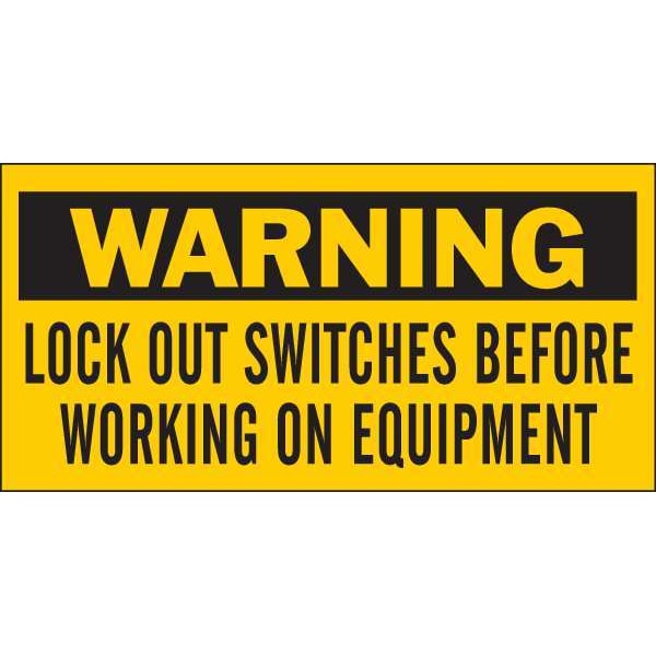 Warning Sign, Sign Subject Matter Lockout Tagout, Height 2 1/4 in, Width 4 1/2 in, Sign Material Vinyl, Sign Mounting Style Adhesive Surface, Header Warning, Legend Lock Out Switches Before Working On Equipment, Printed Language English, Sign Shape Rectangle