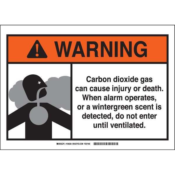 Warning Sign, Sign Subject Matter Chemical, Gas or Hazardous Materials, Height 3 1/2 in, Width 5 in, Sign Material Polyester, Sign Mounting Style Adhesive Surface, Header Warning, Legend Carbon Dioxide Gas Can Cause Injury Or Death. When Alarm Operates, Or A Wintergreen Scent Is Detected, Do Not Enter Until Ventilated., Printed Language English, Sign Shape Rectangle