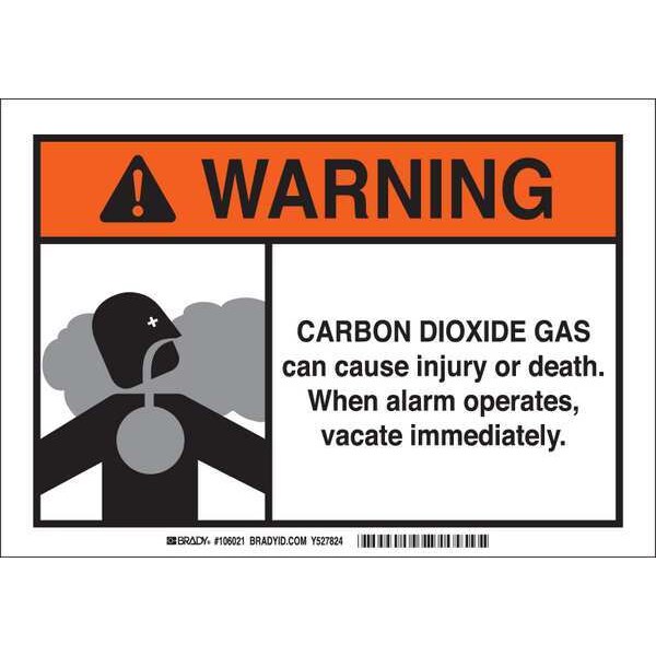 Warning Sign, Sign Subject Matter Chemical, Gas or Hazardous Materials, Height 7 in, Width 10 in, Sign Material Fiberglass, Sign Mounting Style With Mounting Holes, Header Warning, Legend Carbon Dioxide Gas Can Cause Injury Or Death. When Alarm Operates, Vacate Immediately., Printed Language English, Sign Shape Rectangle