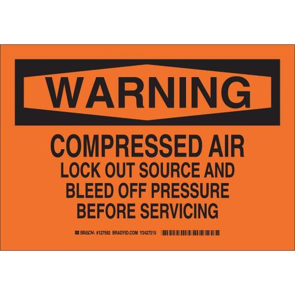 Warning Sign, Sign Subject Matter Lockout Tagout, Height 7 in, Width 10 in, Sign Material Polyester, Sign Mounting Style Adhesive Surface, Header Warning, Legend Compressed Air Lock Out Source And Bleed Off Pressure Before Servicing, Printed Language English, Sign Shape Rectangle