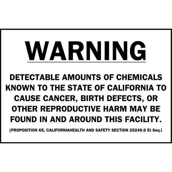 Warning Sign, Sign Subject Matter Health Hazard, Height 7 in, Width 10 in, Sign Material Aluminum, Sign Mounting Style With Mounting Holes, Header Warning, Legend Warning Detectable Amounts of Chemicals Known To The State of California To Cause Cancer, Birth Defects, Or Other Reproductive Harm May Be Found In And Around This Facility., Printed Language English, Sign Shape Rectangle